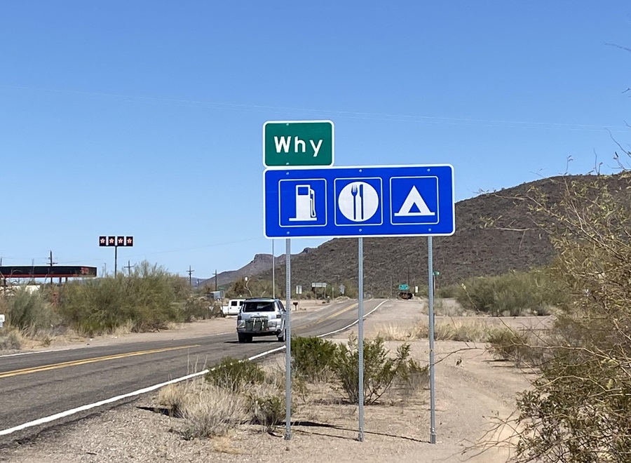 Las leyes de Arizona de la época exigían que los nombres de los lugares tuvieran al menos tres letras para poder ser registrados oficialmente. Así, la simple «Y» se transformó en «Why», creando uno de los nombres de lugar más curiosos de Estados Unidos. A pesar de su nombre interrogativo, Why es un punto de parada para los viajeros que se dirigen al Organ Pipe Cactus National Monument o a la frontera con México.
