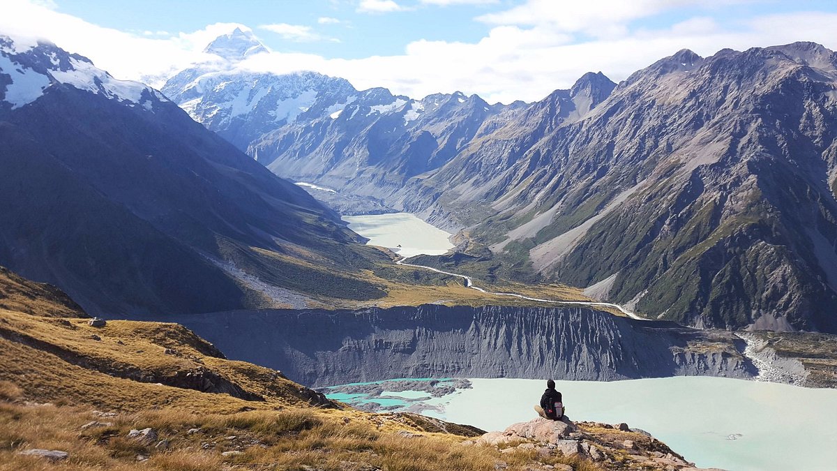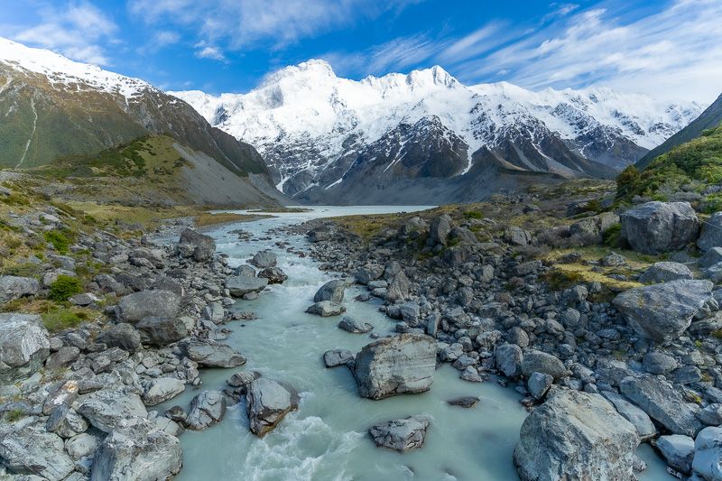 Monte Cook, en el Parque Nacional Aoraki/Mount Cook, es la cima más alta de Nueva Zelanda (3,724 m) y el corazón de los Alpes del Sur, con glaciares y lagos turquesa que brillan bajo el sol. Sus vistas de picos nevados y senderos como Hooker Valley Track dejan sin aliento a los visitantes.